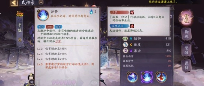 当海原贝戟在场上时,千姬和海原贝戟或者伤害减免,友方单位每使用1点鬼火,可以给海原贝戟增加1层潮声(每叠7层潮声就可以回3点火,并使全体友方伤害永久提升。)