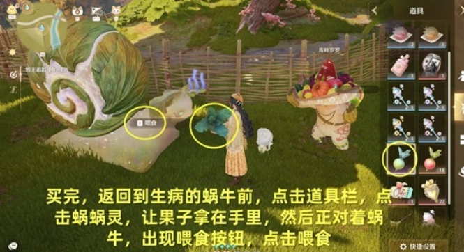 将它拿在手里,然后正对着生病的蜗牛,点击喂食按钮;