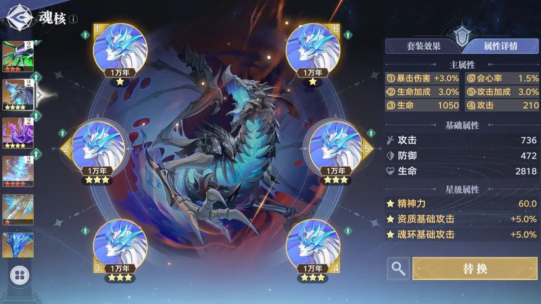 2.古榕:过渡选24星万妖魂核;毕业用4件套24星万妖魂核+2件套精神力魂核。1号位固定精神力,6号位优先精神力或攻击加成。