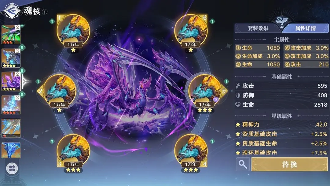 4.宁荣荣:过渡选12星冰蛛魂核;毕业用2件套12星冰蛛魂核+2+2两件套精神力魂核。1号位固定精神力,6号位优先精神力或攻击加成。