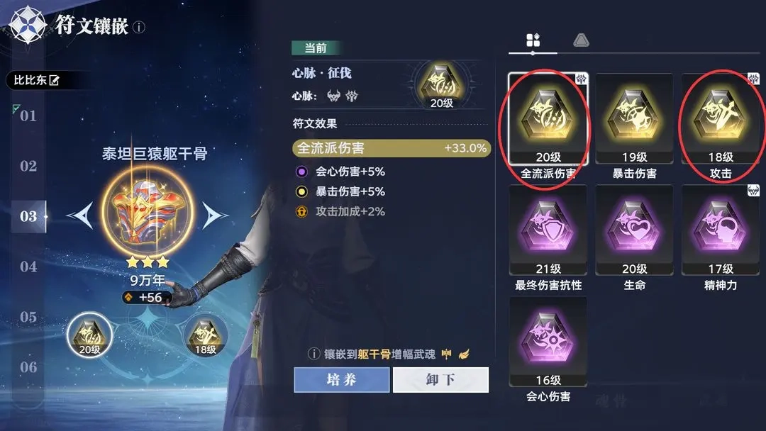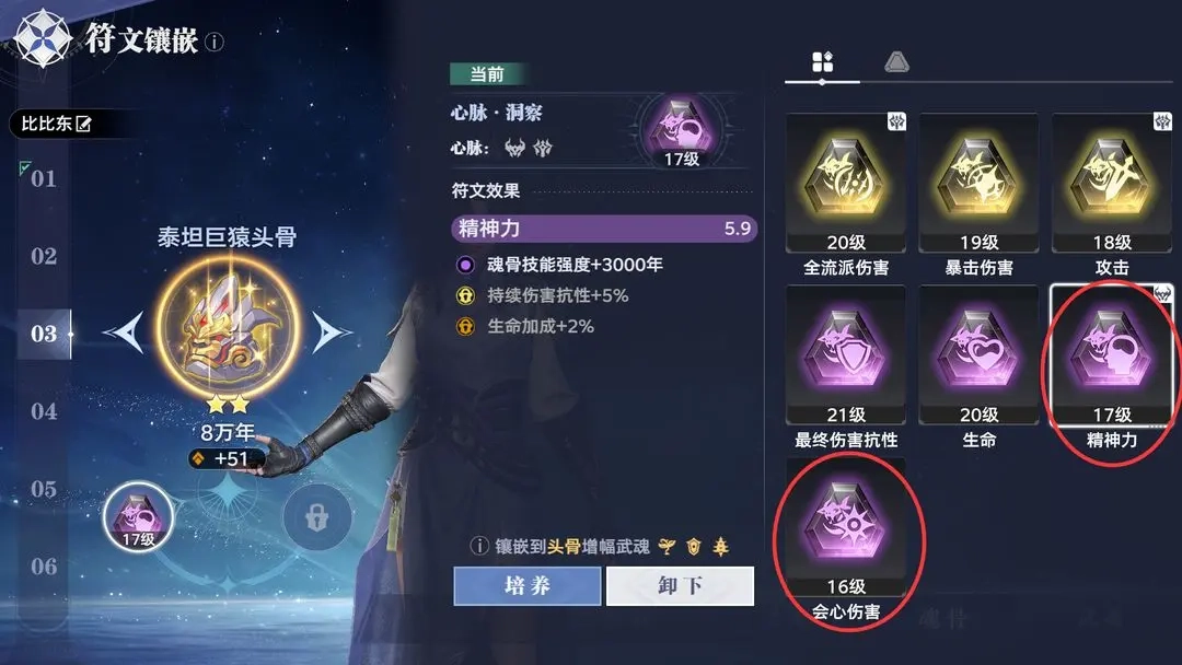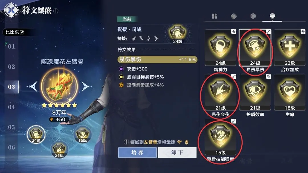 3.左臂骨符文:优先易伤暴伤+易伤会伤+魂骨技能强度,放大敌方受到伤害。