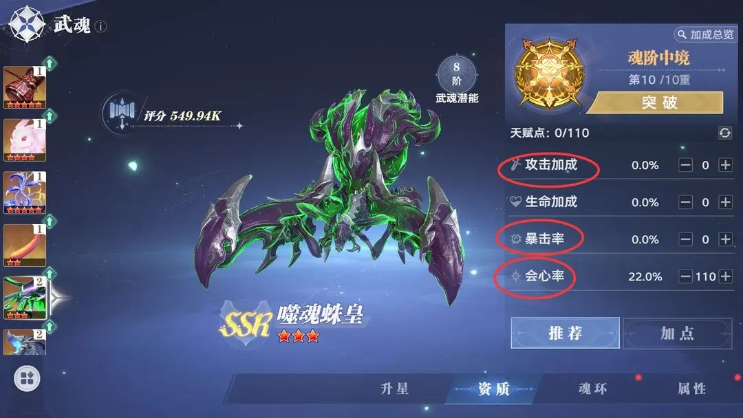 2.武魂资质加点:前期全投攻击力;中期根据流派投入会心率或暴击率,凑齐阈值;后期拉满会心/暴击率,剩余投入攻击加成。