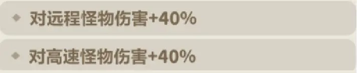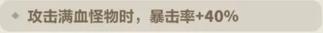该词条仅在靴子部位出现。提供超高额暴击率,触发条件简单,在主线、遗迹夺宝等单人关卡中效果极佳,能快速削减怪物血量。但在合作关卡中,因难以保证每次攻击都针对满血目标,作用会有所下降。