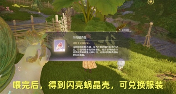 4、成功兑换蜗蜗灵后,回到库叶罗罗所在的位置,打开道具栏找到蜗蜗灵并选中它,然后对准生病的蜗牛,点击喂食按钮。喂食结束后会自动触发剧情对话,此时任务完成,你将获得一张设计图以及用于兑换衣服的材料。