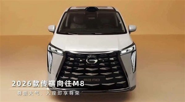 外观方面,2026款传祺向往M8外观采用“一品麒麟”前脸设计,大尺寸格栅内部采用点阵式布局。两侧大灯为分体式结构,上沿是纤细折角形日间行车灯,呈拉长的“7”字造型。下方嵌入格栅旁的是透镜大灯组,灯腔内部带有菱形纹理装饰。