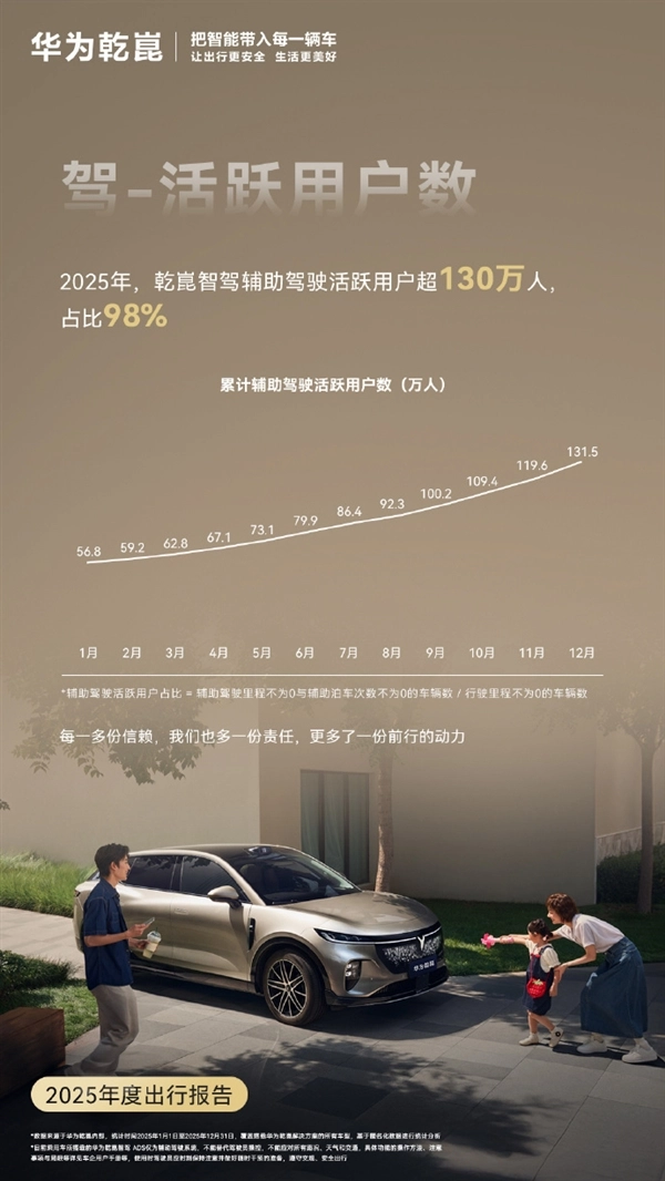 全年乾崑智驾辅助驾驶活跃用户超130万人,占比高达98%,意味着绝大多数用户已养成智驾使用习惯。