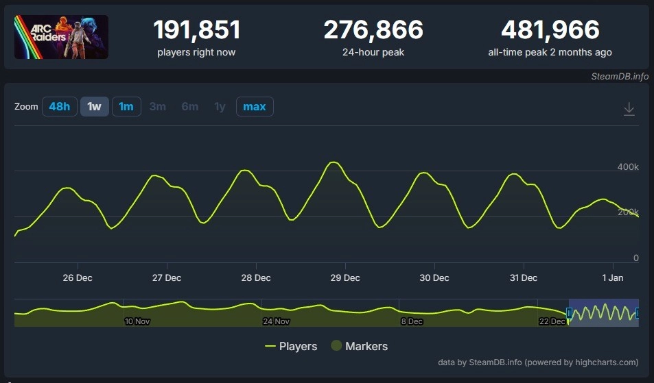 根据SteamDB的数据统计,对比游戏在线玩家峰值记录,《ARC Raiders》在Steam平台发售两个月后,当前仍维持着峰值玩家数量的91%,而《战地6》的在线玩家数量则大幅下滑了85%。报道最后指出:“尽管年度最佳游戏为《33号远征队》,但从销量、玩家规模以及超出预期的表现来看,《ARC Raiders》更具优势。我认为可以说《ARC Raiders》是2025年最为成功的电子游戏范例。”