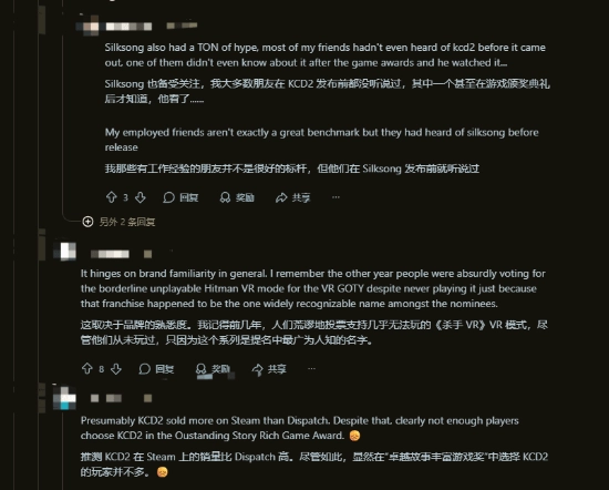 部分玩家将矛头直指《超英派遣中心》和《丝之歌》,因为它们与《天国拯救2》赛道上有竞争关系,而这种对比则让一些玩家理性分析出了《天国拯救2》的一些问题,例如定价比较贵,特别是玩法也比较小众,比较难推广,因而玩家投票的奖项里他们有一定劣势。