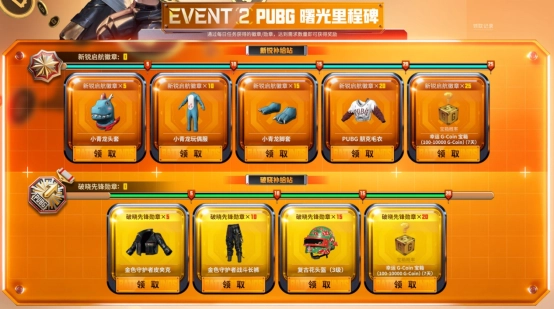 活动2:PUBG曙光里程碑,通过完成活动1累计“新锐启航徽章”和“破晓先锋勋章”,达到对应数量即可解锁补给站中的皮肤和G-Coin宝箱等道具,此次皮肤中有PUBG朋克毛衣和复古花头盔(3级),就这个头盔,可太带派了!