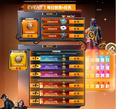 活动1:每日登录&任务,活动期间内完成每日登录即可获得活动道具“新锐启航徽章”,同时可在三个宝箱中任选一个作为登录奖励;完成每日时长任务可获得活动道具“破晓先锋勋章”,每周末(周五-周日)三天中任意一天完成时长任务还可额外获得一个幸运 G-Coin 宝箱(100-10000 G-Coin)(7天),而在1月30日-2月1日三天中,每天完成时长任务均可获得一个幸运 G-Coin 宝箱(100-10000 G-Coin)(7天)。