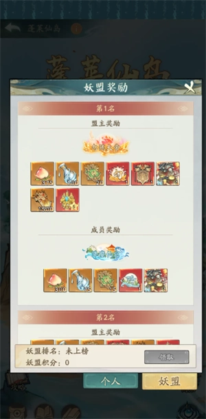 蓬莱分一/二/三层,层数越高积分效率、奖励越优;每日按妖盟积分排名晋级/保级/降级,淘汰盟无法参与次日活动。