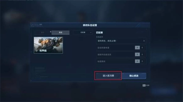 在主界面点击机甲战 → 右上角队伍设置 → 练习赛