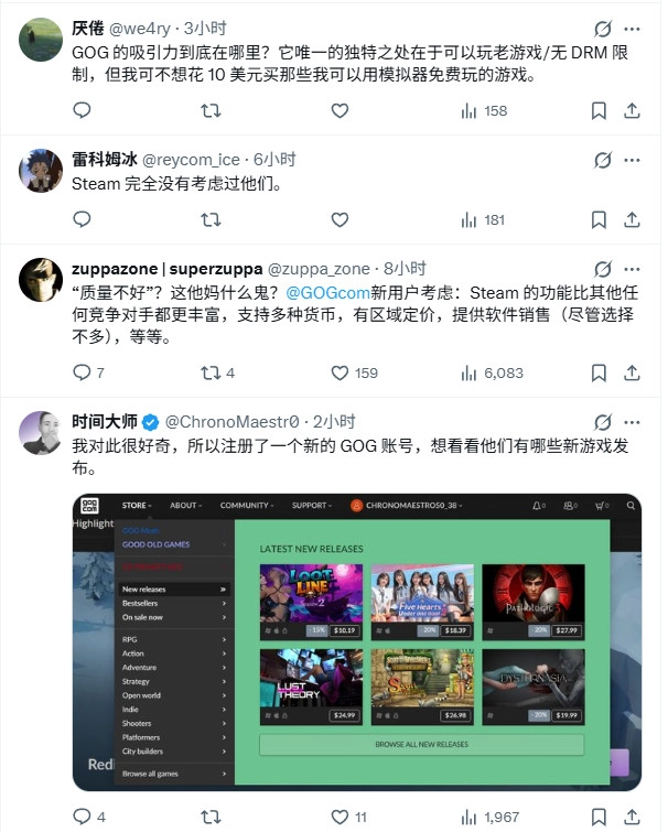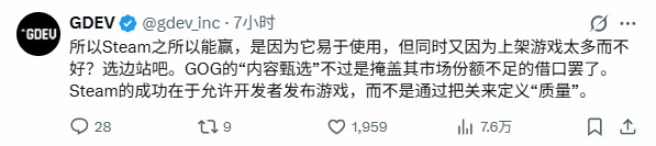 他还强调,GOG的另一大优势在于只提供经过严格筛选的内容。他表示:“GOG不会每天上线数百款游戏,因为其中95%的作品并不能称得上高质量。”虽然他并未点名,但外界普遍认为这是在暗指Steam的平台策略。
