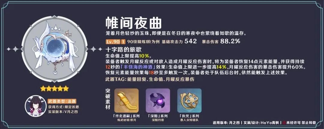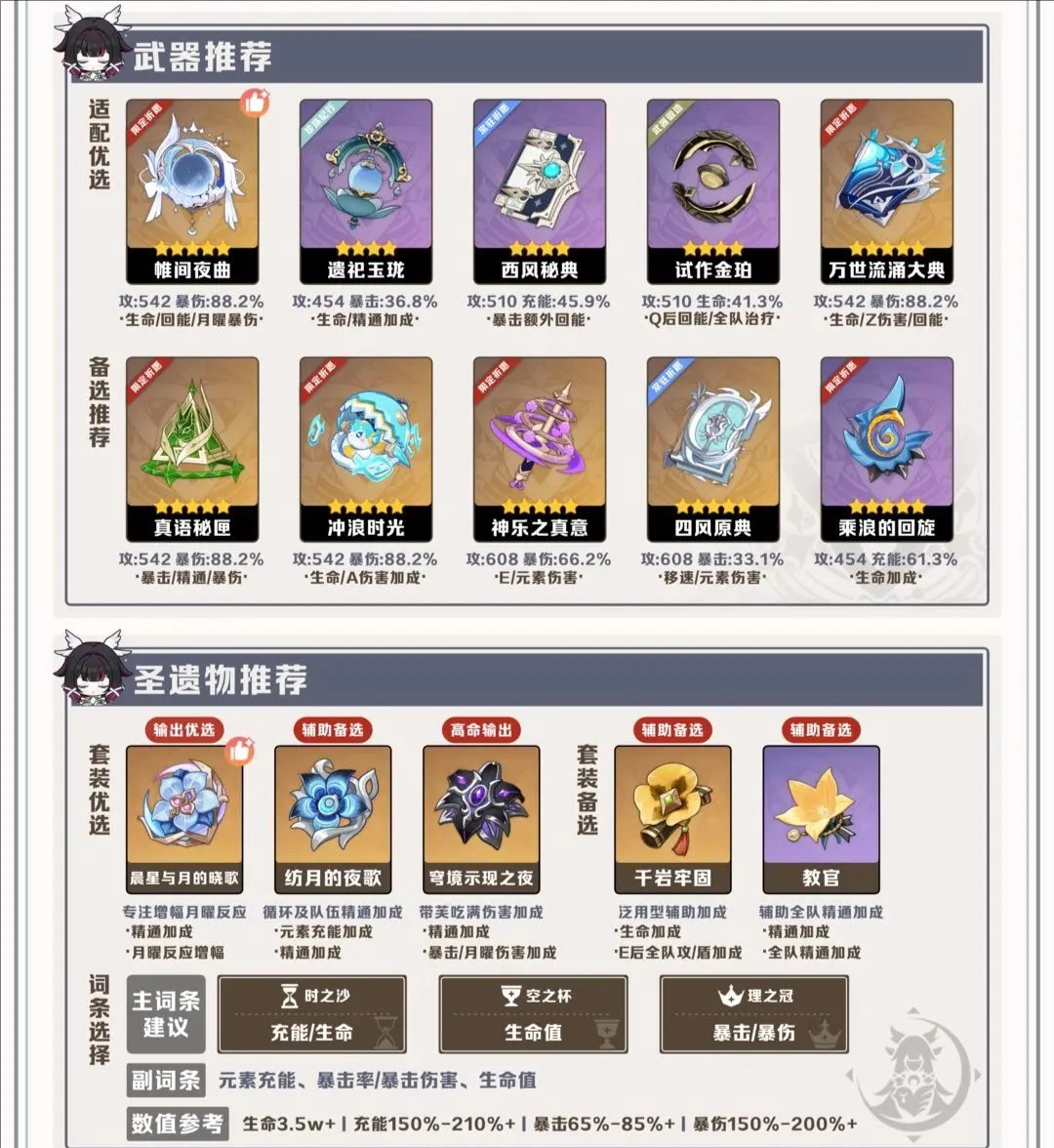 圣遗物首选提供元素精通与月曜反应增伤的晨星套,但需注意队伍搭配限制。纺月套也是优秀选择,提供充能与精通。词条方面,沙漏首选元素充能效率或生命值,杯子选择生命值,头冠选择暴击或暴击伤害。核心在于优先将元素充能效率堆叠至阈值(单水队约180%-210%,双水队约150%-180%)以保证每轮循环都能开启大招,之后再全力堆叠生命值与双暴属性。