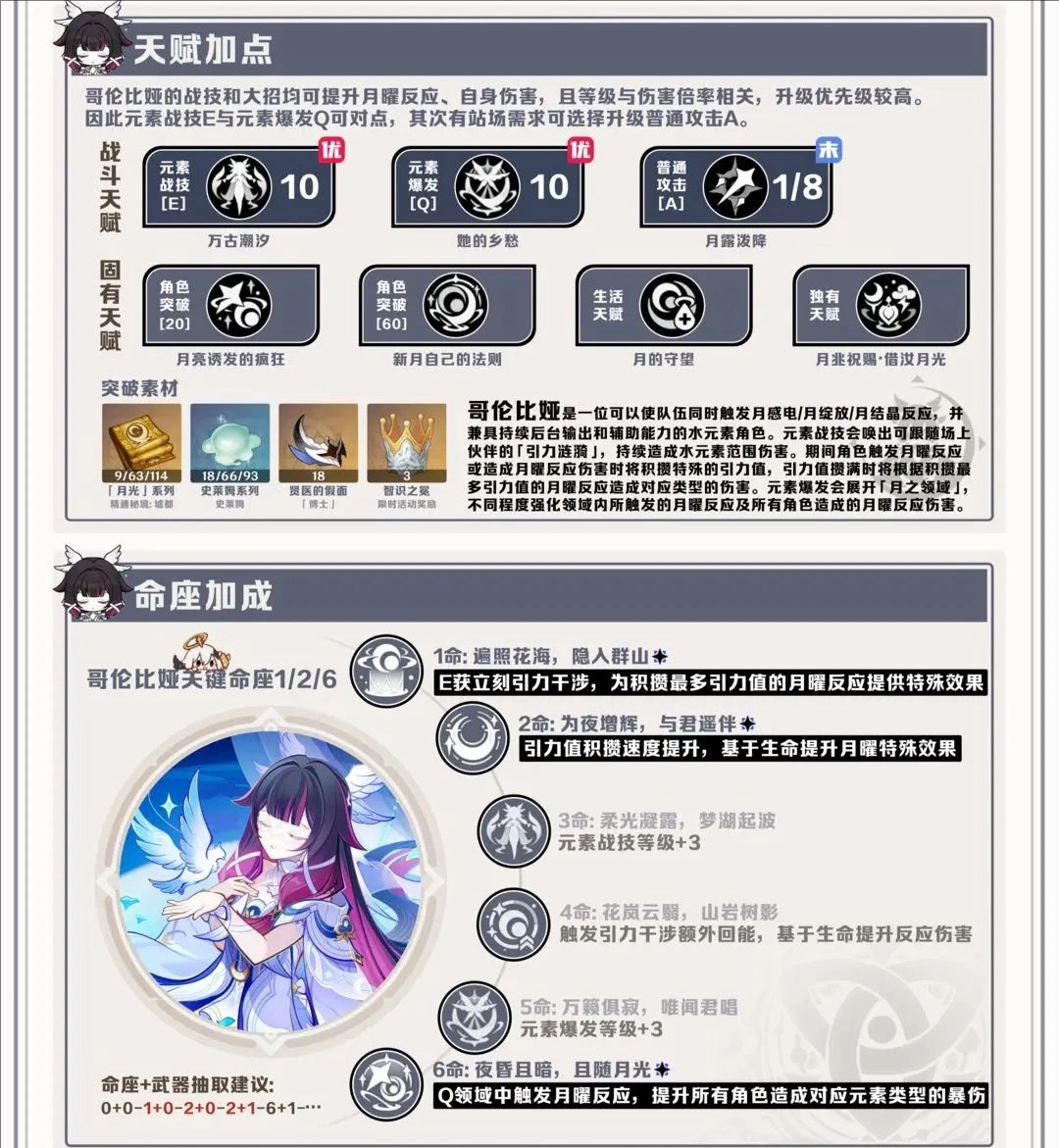 哥伦比娅的特殊天赋能将队伍的感电、绽放、结晶反应转换为对应的月曜反应,并基于其生命值提升月曜反应的基础伤害。其核心输出循环在于:开启元素战技后,生成的引力涟漪会在队伍触发月曜反应时积蓄“引力值”。当引力值攒满时,会根据积蓄最多的反应类型,触发一次高额的“引力干涉”伤害,这是她重要的后台伤害来源。