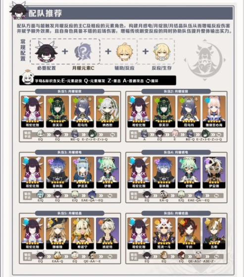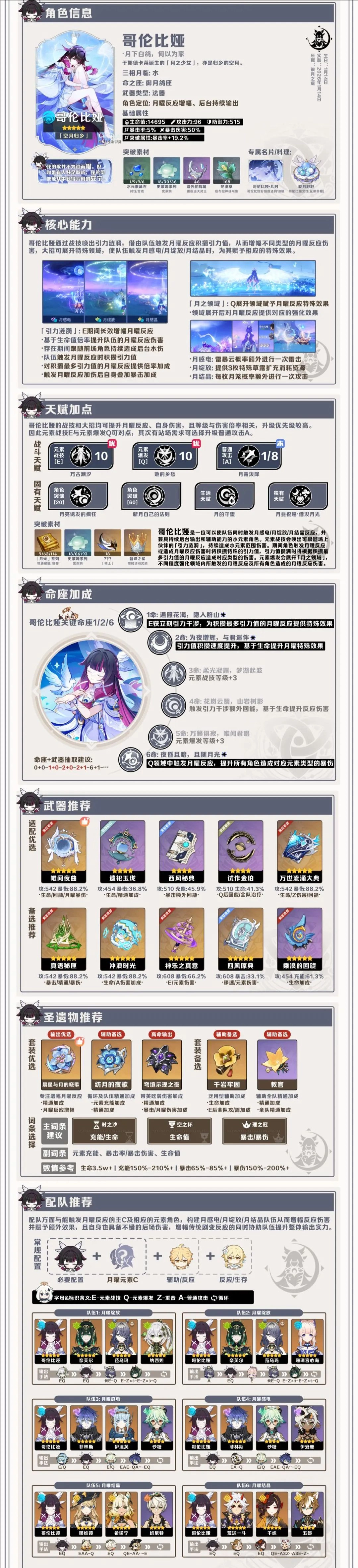 哥伦比娅的配队核心在于搭建“月兆”体系,也就是以她触发的月曜反应为核心来组建队伍。常见的搭配有:和雷元素角色组合的“月感电”队,与草元素角色搭配的“月绽放”队,或是跟岩元素角色组队的“月结晶”队。她能够作为核心辅助兼副输出加入队伍,借助月之领域和被动天赋显著提高整个反应体系的上限。即便在非纯月曜队伍里,她也能通过反应转换带来不错的增益。