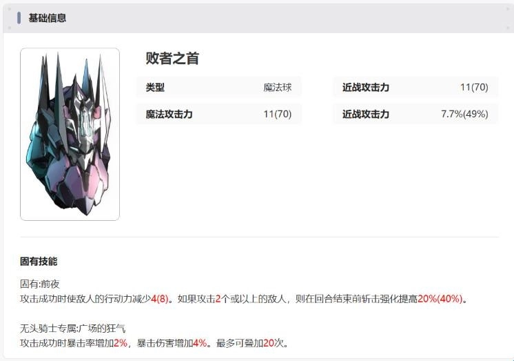 * 被动只在无头自身行动时生效,行动结束后效果消失。因此行动结束后45%近战攻击力会消失,无头骑士的反击伤害会变低。