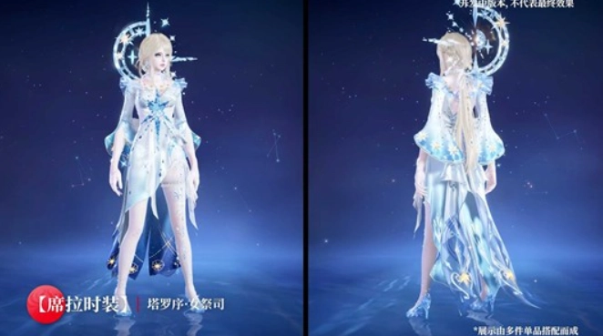 ‑冷月蓝+星银,象征“睿智与慈爱”:披风为半透星图,移动时可见十二星座依次点亮;长剑「远见圣辉」剑格镶嵌塔罗圆镜,拔剑时随机闪现0.3秒未来残影