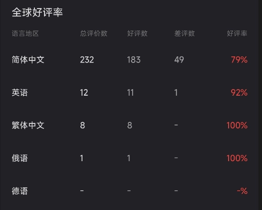 在现有的265条评测中,好评率高达81%。其中简中地区占绝对大头,共计232条评价,好评率为79%。