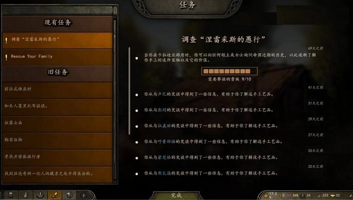 4.4、然后我们沿途经过村庄,看到村庄有感叹号,如果不需要绕路的话,就可以去看看是什么任务,容易做的任务就做一下,配合魅力里面的雄辩术,也能一个任务加二声望,还能改善和村庄要人的关系,增加招兵槽。特别是有白板女儿的版本,可以频繁的去看一下,看能不能找到寻找女儿或者家族世仇,这一类能提供白板NPC的任务。没白板女儿的版本做任务,主要就是为了改善和要人的关系,增加招兵槽,然后顺便赚一点钱和提升声望。