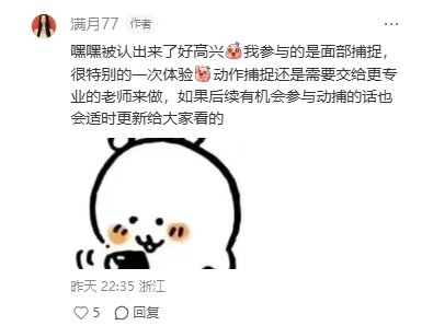 “嘿嘿,被认出来啦,好开心!我参与的是面部捕捉工作,这是一次特别的体验。动作捕捉还是得交给更专业的老师来完成,如果后续有机会参与动捕的话,我也会适时更新给大家看的。”