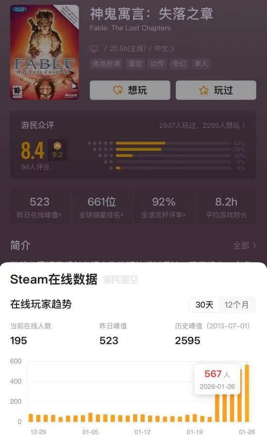 在Steam平台上,《神鬼寓言:周年纪念版》近期的峰值玩家数量达到了3737人,和去年12月相比猛增789.8%,这一数据创下了该作自2014年9月发售以来,历经11年半时间的最高纪录。与此同时,《神鬼寓言:失落之章》的玩家人数也实现了600%的增长,其同时在线玩家数量达到567人,同样是近11年半以来的最高数值。