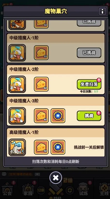 游戏中的体力资源“奶酪”应优先用于主线推图。当奶酪全部消耗完毕后,再使用“魔物巢穴”的扫荡功能来获取额外奖励,这是一种高效的资源转化方式。日常可通过“魔宠”系统中的“切磋”关卡补充奶酪。