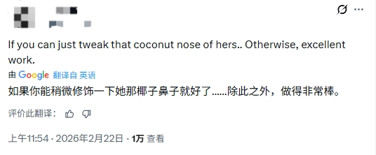 评论区,有玩家表示认可:“如果你能稍微修饰一下她那椰子鼻子就好了,除此之外,做得非常棒。”