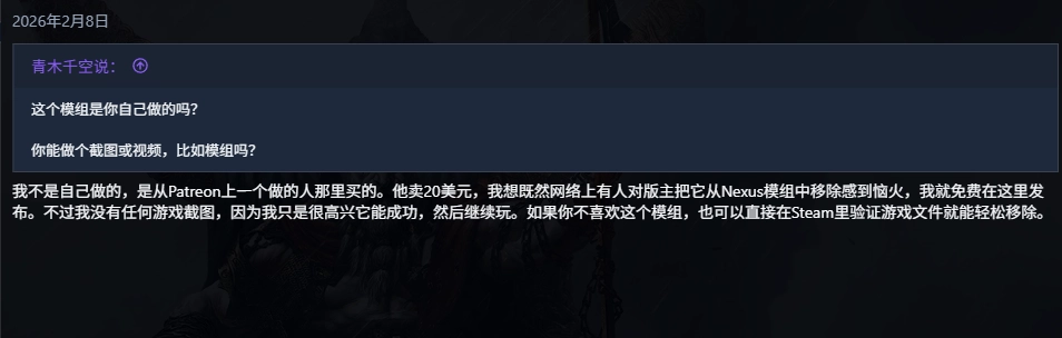 另外,在AyakaMods网站上,有用户提问:“这个模组是你自己开发的吗?能不能给这个模组举个例子,比如截张图或者录段视频?”上传者回应说:“这不是我自己做的,是我从Patreon上一位制作该模组的人那里购买的。当时他卖20美元,我考虑到网上很多人因为版主将它从Nexus Mods上移除而不满,就干脆免费分享到这里了。不过我确实没有游戏截图,因为当时看到它能正常使用就很开心,接着就继续玩游戏了。另外,如果你们不喜欢这个模组,移除起来也很简单,只要在Steam里验证一下游戏文件的完整性就可以了。”
