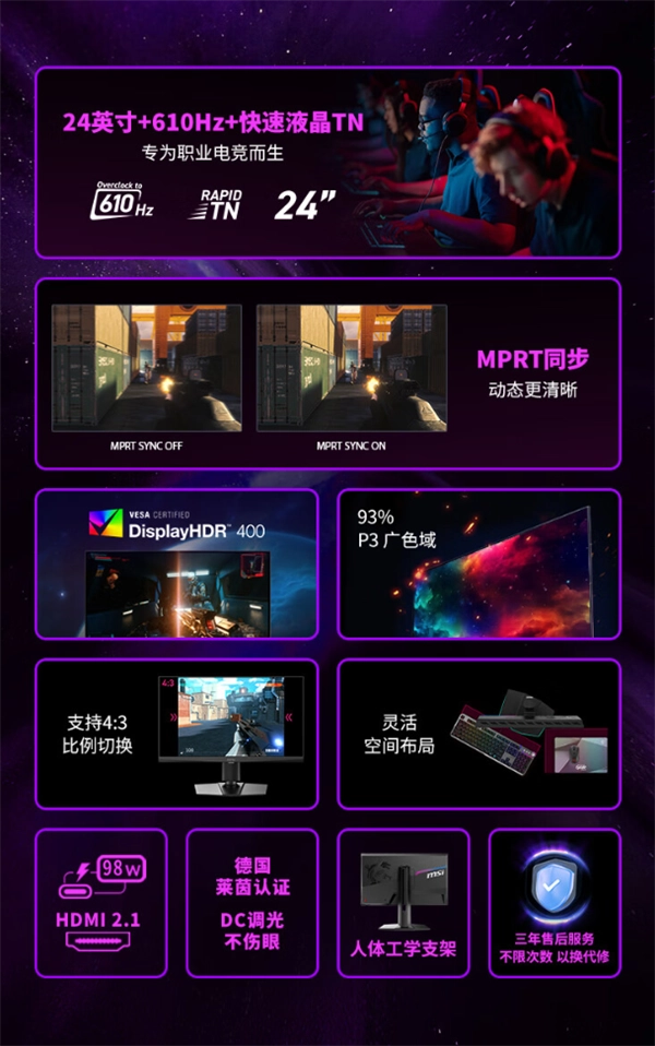除了超高刷新率,MPG 242R X60N还配备了MPRT同步功能,通过动态画面清晰技术,进一步减少画面模糊。其采用的快速液晶TN面板,在色彩还原与响应速度之间取得完美平衡,兼顾了电竞性能与视觉舒适度。