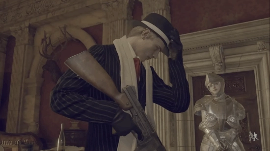第4名:黑手党西装(生化4):经典的细条纹西装配白色围巾。文章盛赞没人能拒绝穿条纹西装的里昂,尤其是配合打字机时的丢帽动作。