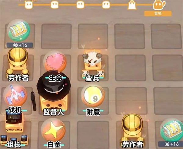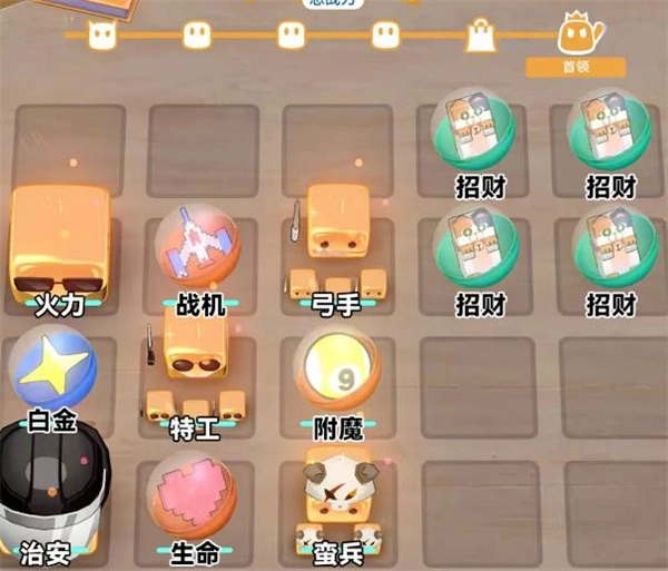 2、田径社:阵容摆放如图所示,优先升级火力专家,输出BUFF全喂给它,巨大化优先给火力,其次给治安招财猫摆3个就够用,优先堆战力商店优先买弓手、蛮兵和巨大化。