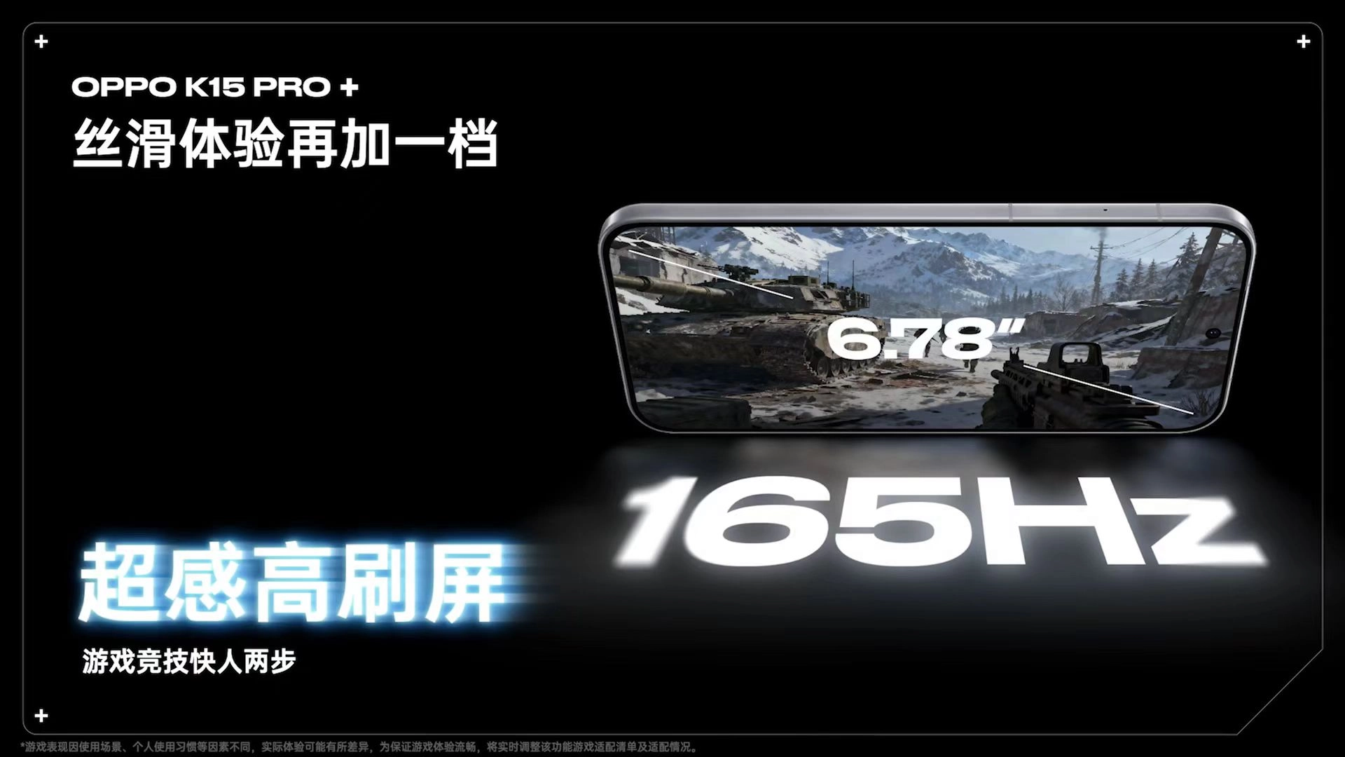 至于OPPO K15 Pro+则配备了尺寸更大的屏幕,同时支持165Hz的超高刷新率。不过客观来说,目前支持165帧满血运行的游戏极少,这个参数更多是为了拉高规格,日常实际体验和120Hz差别不大。