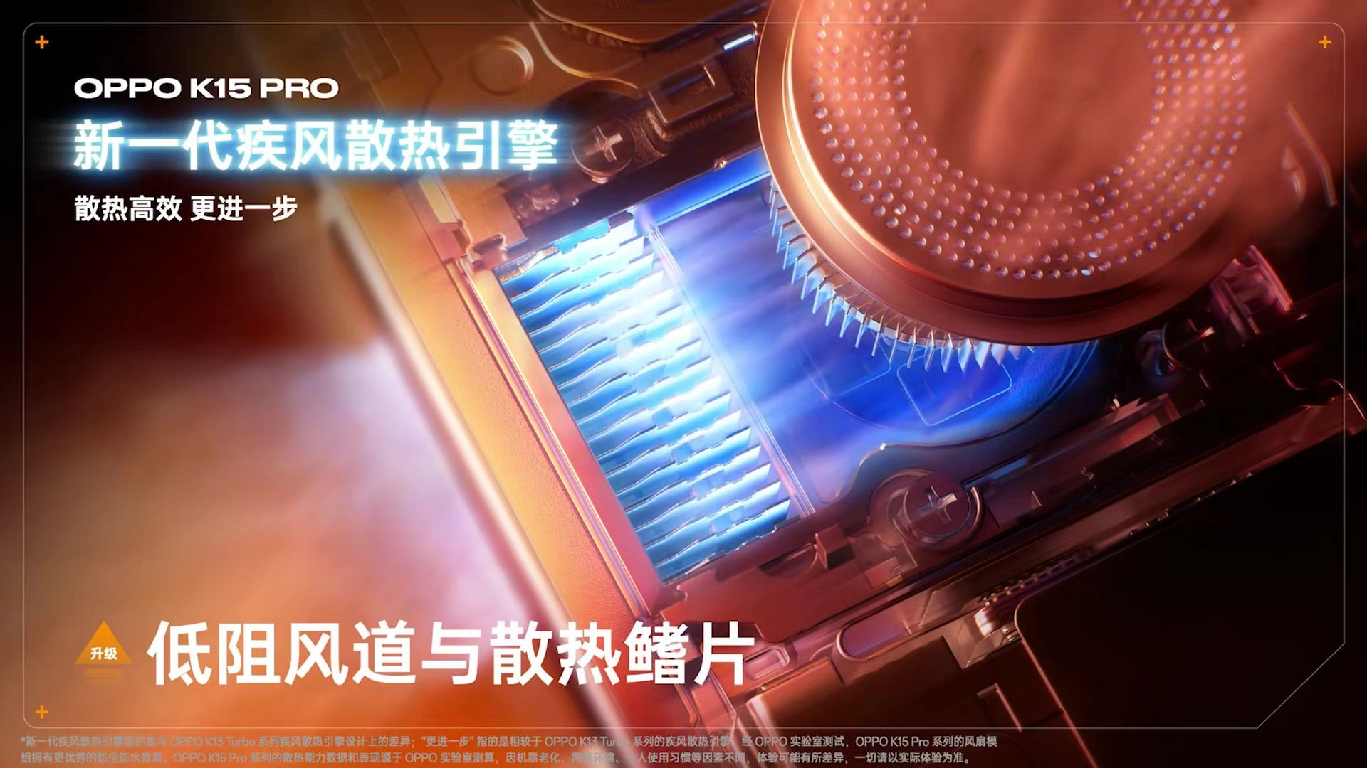 OPPO K15 Pro不仅在保持大约8.3mm厚度和197g重量的前提下,塞进了一块7500毫安时的冰川电池,还巧妙地放进了一个微型风扇,这让它成为了目前尺寸最紧凑的主动散热手机,也让重度使用一天不充电成为了现实。