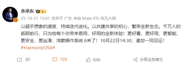 与此同时,他邀请大家于10月22日14:30一同见证鸿蒙操作系统6的正式亮相。