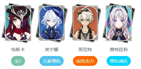 常规配队 :恰斯卡 + 芙宁娜 + 班尼特 + 茜特菈莉,集减抗、增伤、攻击拐于一身,适合大多数场景。