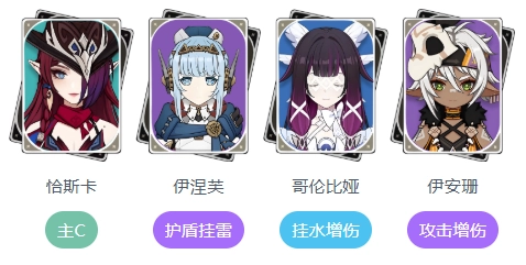 科研搭配推荐:恰斯卡、伊涅芙、哥伦比亚与伊安珊组合,借助护盾挂雷、挂水增伤等机制来强化输出效果,不过该阵容对角色的命座有一定要求。