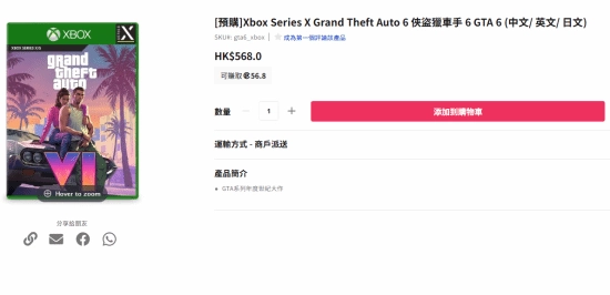 香港知名线上商店the club的《GTA6》实体版页面已标注售价,为568港元,换算成人民币约495元。