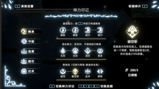 于瞬息之间躲避攻击的【瞬身】、灵活腾挪的【踏空】、以坚不可摧的防御反击敌人的【守御】、以狂风骤雨般的攻击压制敌人的【强袭】、操控生灵辅助战斗的【召灵】……