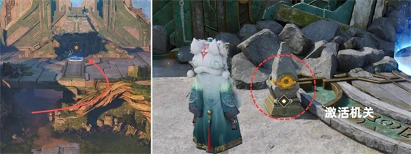2、之后前往二楼祭台处激活机关,牵引蓝色石头,用源流之子攻击柱子上方树枝激活机关变为蓝色,将石头放置踏板上后,激活蓝色机关后变为黄色。之后用源流之子攻击烧掉前方树枝,激活机关变为蓝色,角色站在踏板上开启祭坛,前往祭坛中间就可以获得钥匙碎片2。