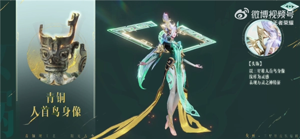 据了解,该皮肤整体形象以“人首鸟身像” “眼形器” “金面具”等三星堆文物为灵感,结合东方幻想风格进行设计。
