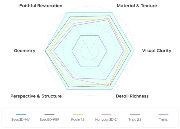 在与现有3D生成模型的对比中,Seed3D1.0展现出优势:其纹理与材质生成性能超过此前的开源及闭源模型,几何生成性能超过业界更大参数规模的模型,综合能力达到行业领先水平。