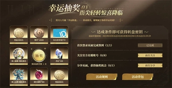 进入游戏官网完成任务后可参与抽奖,获取游戏内奖励。