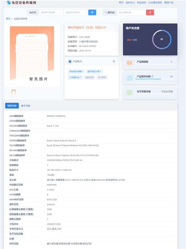 电信设备终端网显示,WIKOX70内置6000mAh电池,配备6.7英寸AMOLED屏幕,分辨率为2412x1080,前置3200万像素镜头、后置5000万像素镜头,支持红外遥控。