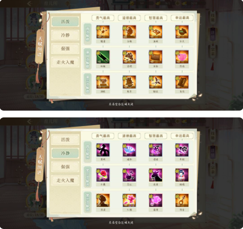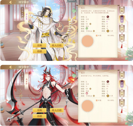 一般来说活泼性格的侍君可以培养成宫人和侍君、冷静为可以给自己戴帽子的侍君(?)和羽卫、倔强性格的为暗者与侍君(驴子也挺好玩挺魔性的),走火入魔会出一些奇奇怪怪的技能(可以实现男男之恋),具体的自己看吧。