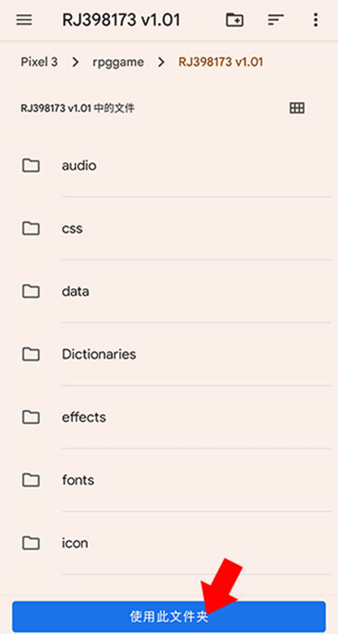 3、找到我们刚刚解压的游戏目录,并点击下方的使用本目录文件(如果非RPG Maker MV制作的游戏,会弹窗提示无法游玩)