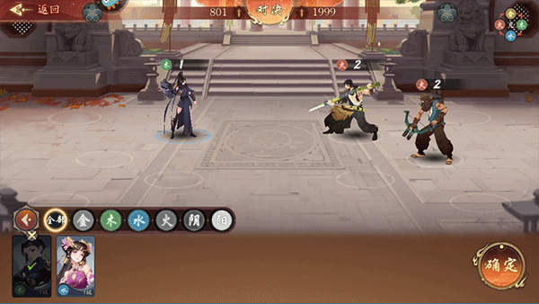 6、根据对手的人数和属性“布阵”,点击选择相应角色上场;(上场后需根据角色的战斗特性,调整合适的站位哦)