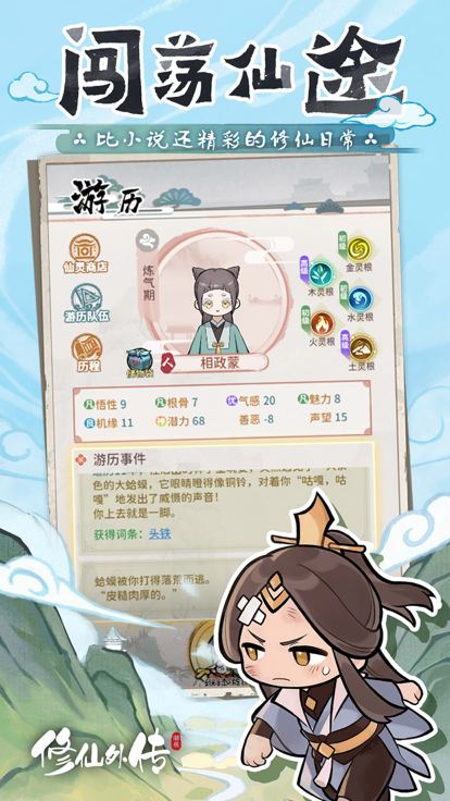 可以通过收集和培养伙伴来为仙灵组建一支队伍,修仙之旅绝不寂寞!部分伙伴携带可继承词条,在游历中也有一定概率会触发赠送法宝。