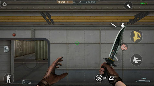 游戏画面左下角和右下角各有一个圆圈状的虚拟按钮,玩家通过滑动虚拟按钮控制人物的动作。其中左下角的虚拟按钮控制移动 右下角的虚拟按钮控制准星和射击。同时,在画面左侧还分布有战绩查询、蹲下、换背包等按钮,画面右侧分布有跳跃、切换主/ 副武器、换子弹等按钮。