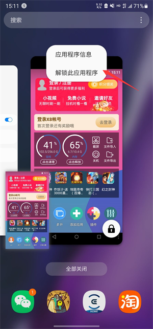 最后在手机后台多任务,按住X8沙箱,会出现三个按钮,选择锁住。